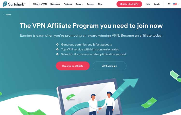من خلال الترويج لـ Surfshark ، يمكن للشركات التابعة كسب حصة عائد بنسبة 40٪ لكل اشتراك يتم بيعه. نظرًا لأن هذا المنتج يقدم أسعارًا تنافسية فائقة ومجموعة واسعة من الميزات ، فإنه يتحول جيدًا في الكثير من الأسواق.